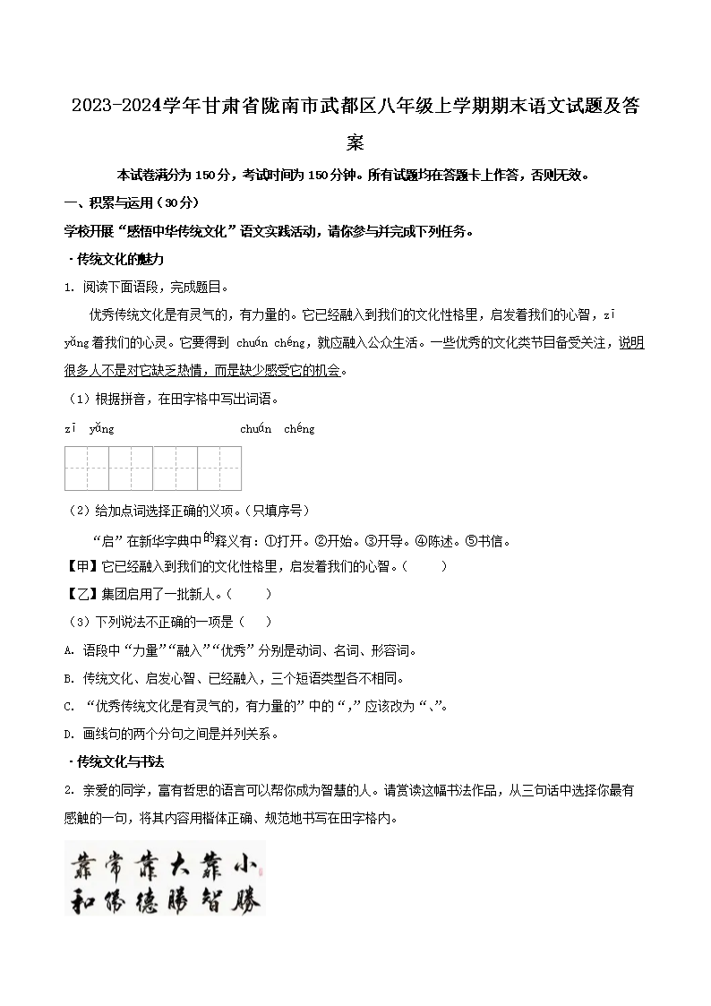 2023-2024學(xué)年甘肅省隴南市武都區(qū)八年級上學(xué)期期末語文試題及答案(Word版)
