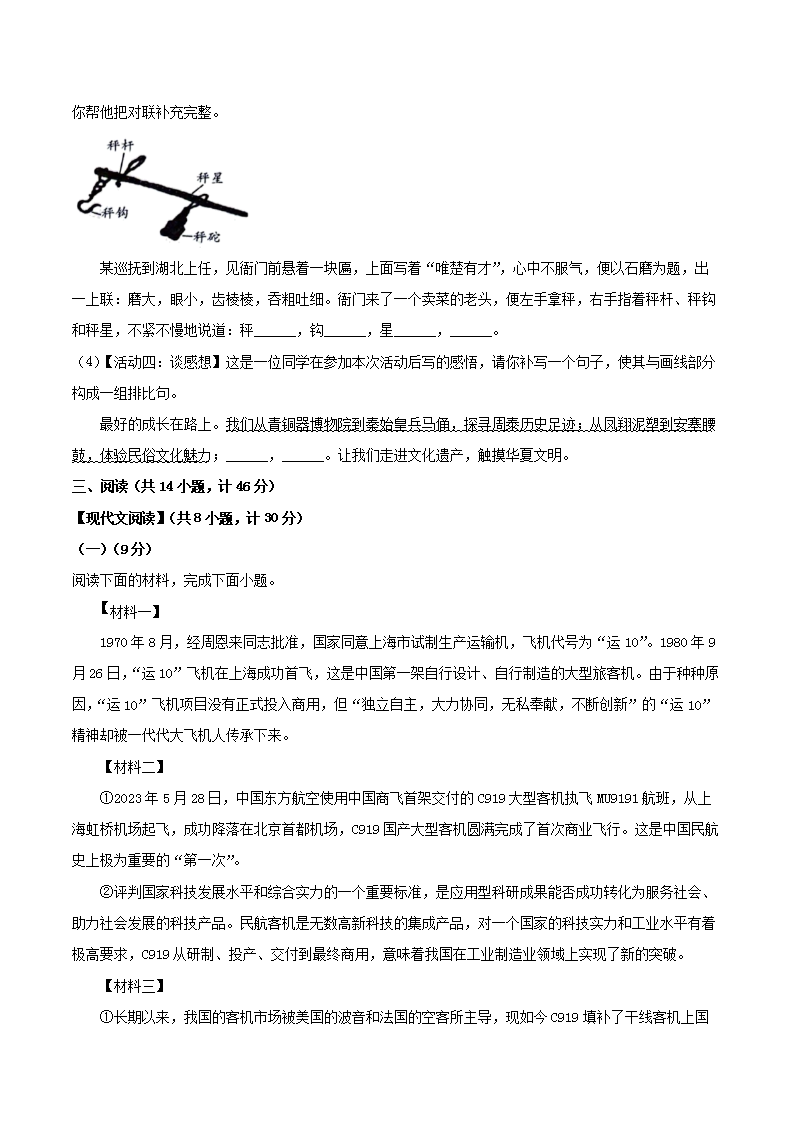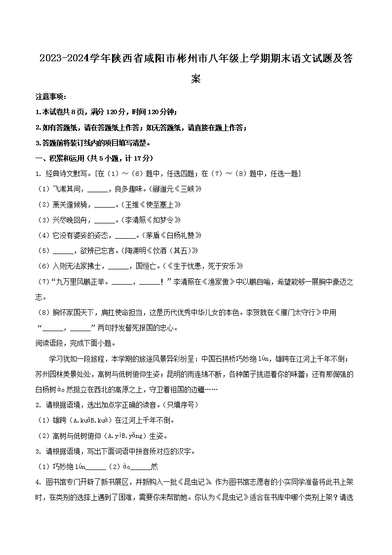時(shí)間:2025-04-16 17:26:00 來源:無憂考網(wǎng) [字體:小 中 大]【文檔名稱】 2023-2024學(xué)年陜西省咸陽市彬州市八年級(jí)上學(xué)期期末語文試題及答案(Word版).doc