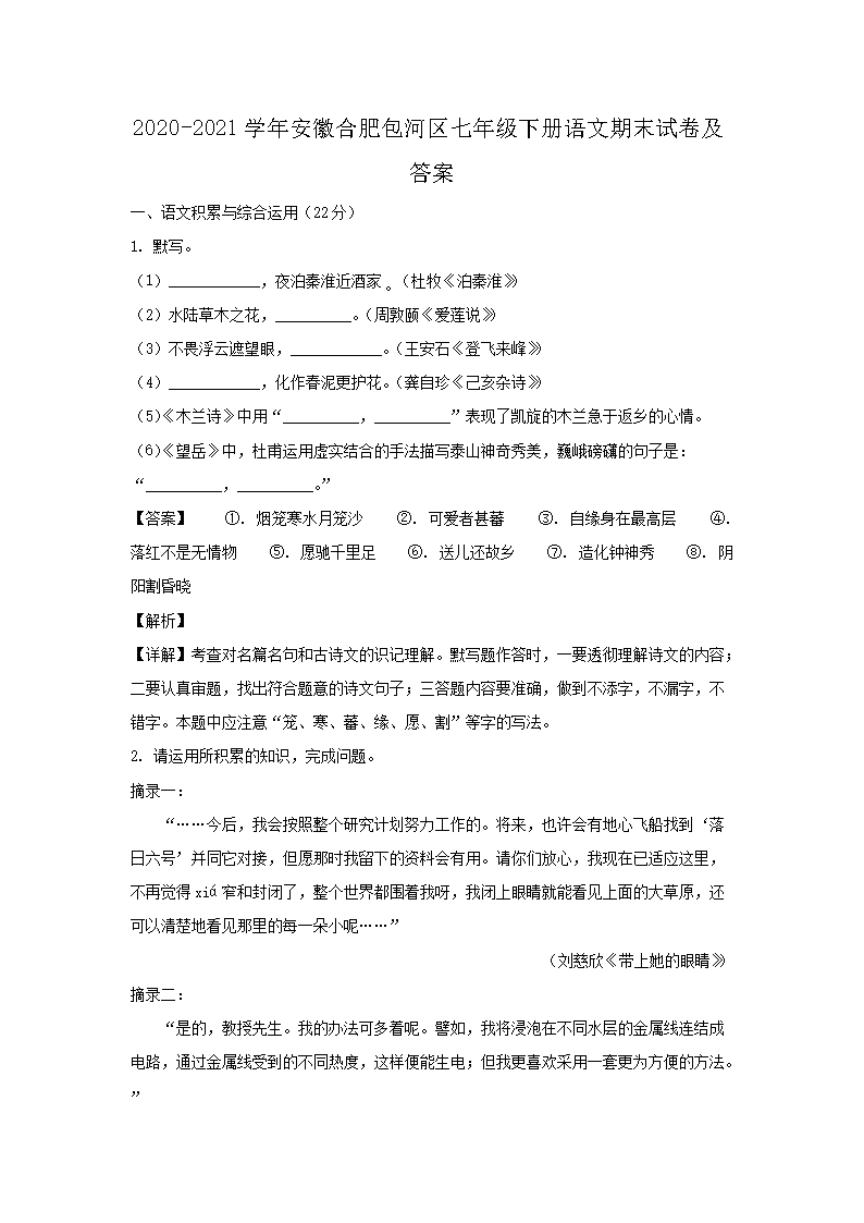 【文檔名稱】 2020-2021學(xué)年安徽合肥包河區(qū)七年級下冊語文期末試卷及答案(Word版).doc