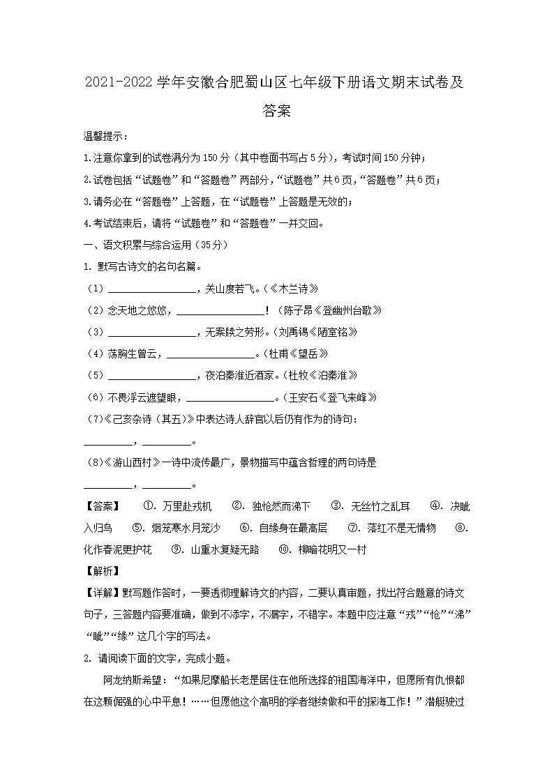【文檔名稱】 2021-2022學年安徽合肥蜀山區(qū)七年級下冊語文期末試卷及答案(Word版).doc