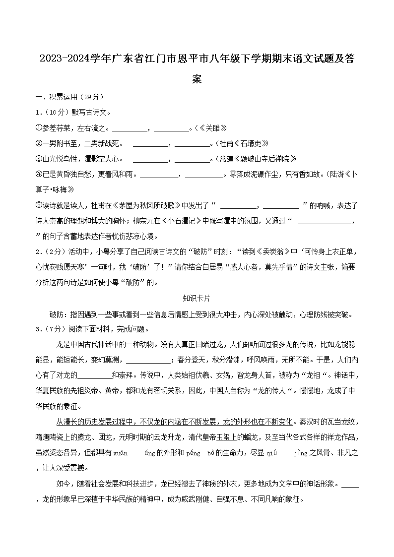 2023-2024學(xué)年廣東省江門市恩平市八年級下學(xué)期期末語文試題及答案(Word版)