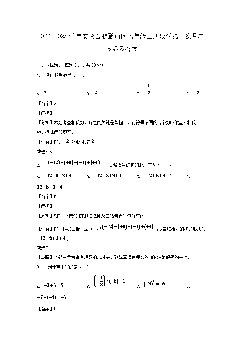 【文檔預(yù)覽】 無(wú)憂考網(wǎng)整理發(fā)布2024-2025學(xué)年安徽合肥蜀山區(qū)七年級(jí)上冊(cè)數(shù)學(xué)第一次月考試卷及答案(Word版),前五頁(yè)預(yù)覽如下: