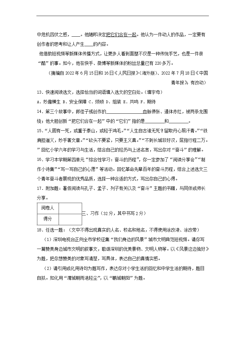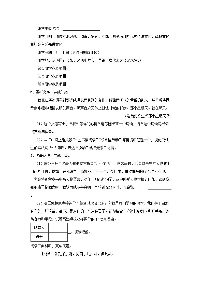 2023年廣東省深圳市寶安區(qū)小升初語(yǔ)文試卷及答案(Word版)