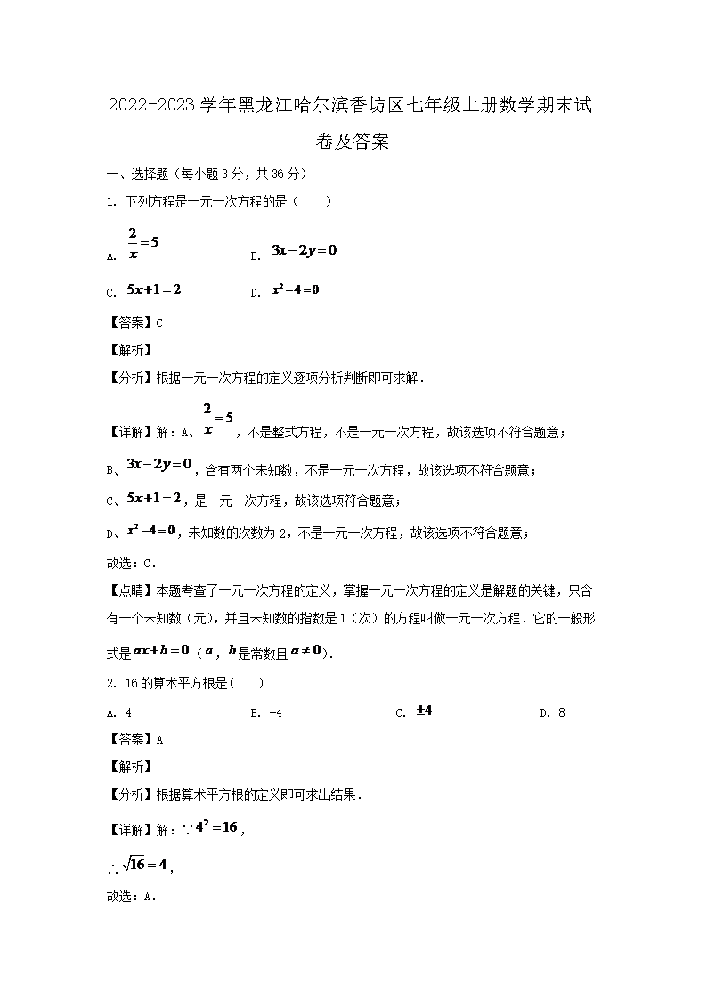 【文檔名稱】 2022-2023學年黑龍江哈爾濱香坊區(qū)七年級上冊數(shù)學期末試卷及答案(Word版).doc