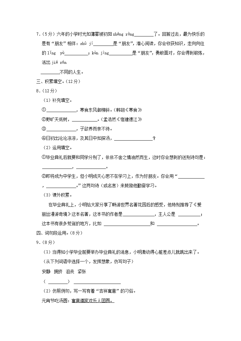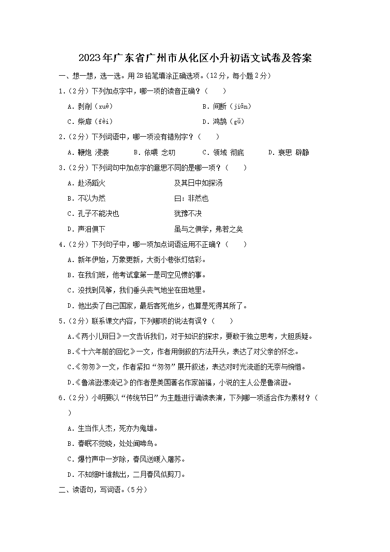 2023年廣東省廣州市從化區(qū)小升初語(yǔ)文試卷及答案(Word版)
