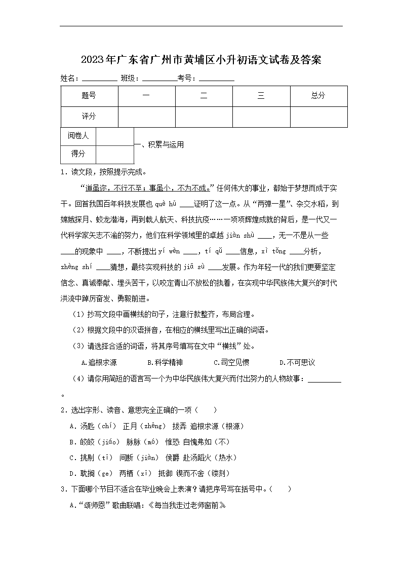 【文檔名稱】 2023年廣東省廣州市黃埔區(qū)小升初語文試卷及答案(Word版).doc