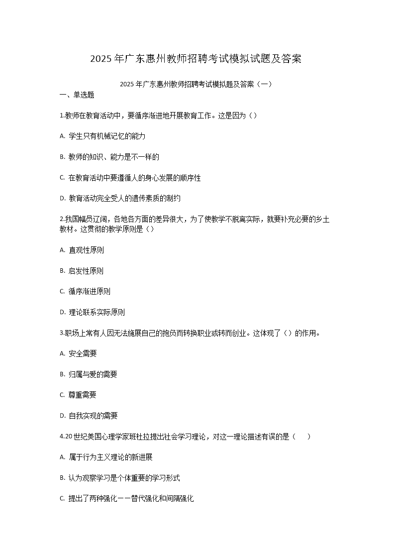 【文檔名稱】 2025年廣東惠州教師招聘考試模擬試題及答案(Word版).doc