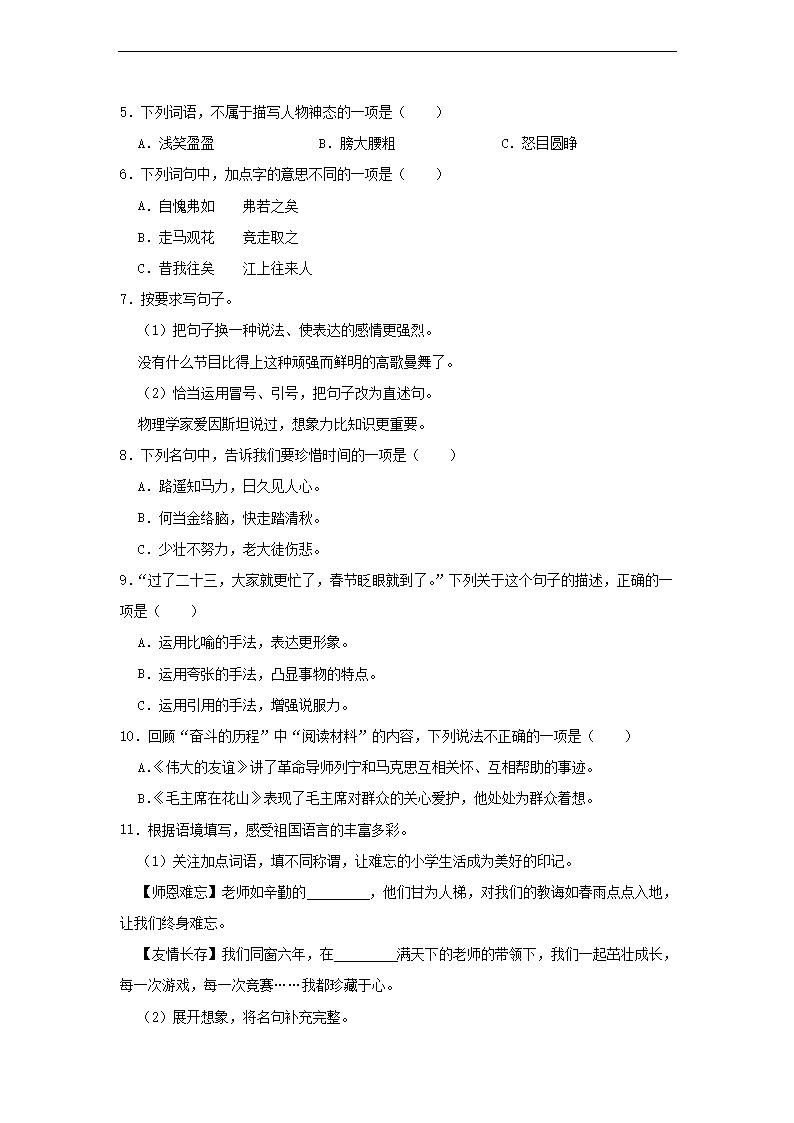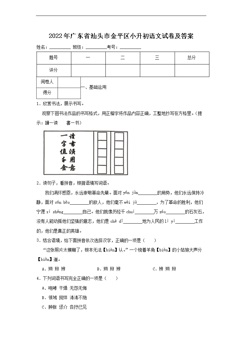2022年廣東省汕頭市金平區(qū)小升初語(yǔ)文試卷及答案(Word版)