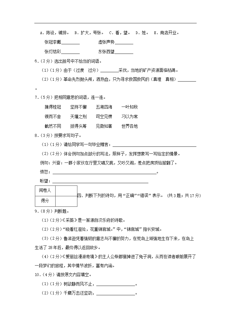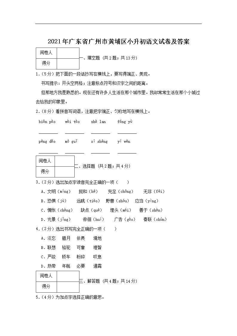 【文檔名稱】 2021年廣東省廣州市黃埔區(qū)小升初語文試卷及答案(Word版).doc