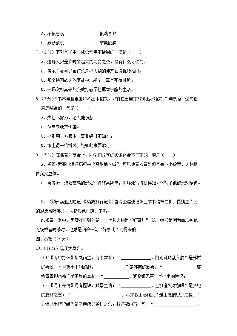 - 2022-2023年廣東省市從化區(qū)六年級下冊期末語文試卷及答案