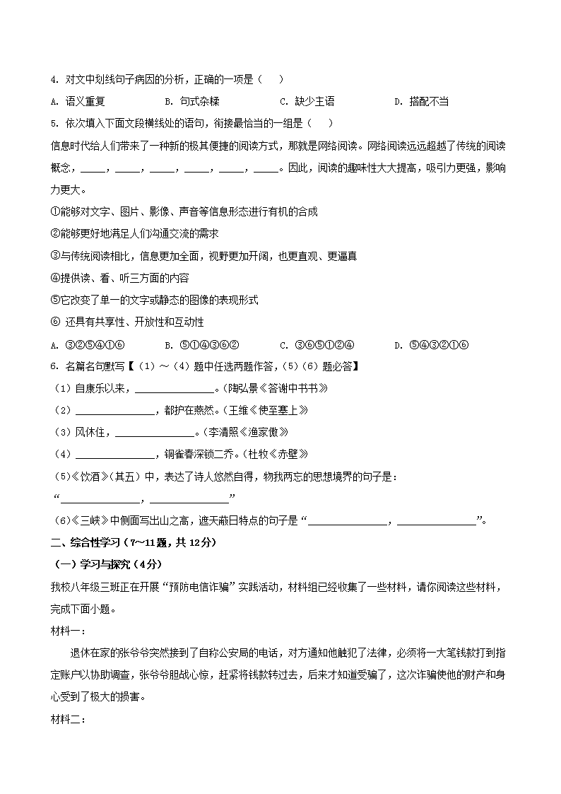 - 2023-2024學年江蘇省句容市八年級下學期期末語文試題及答案