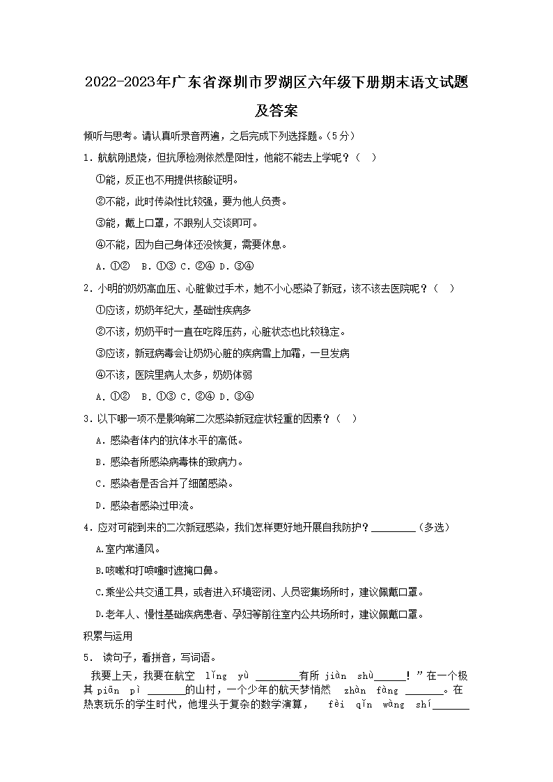 - 2023-2024年廣東省深圳市羅湖區(qū)六年級下冊5月語文試卷及答案
