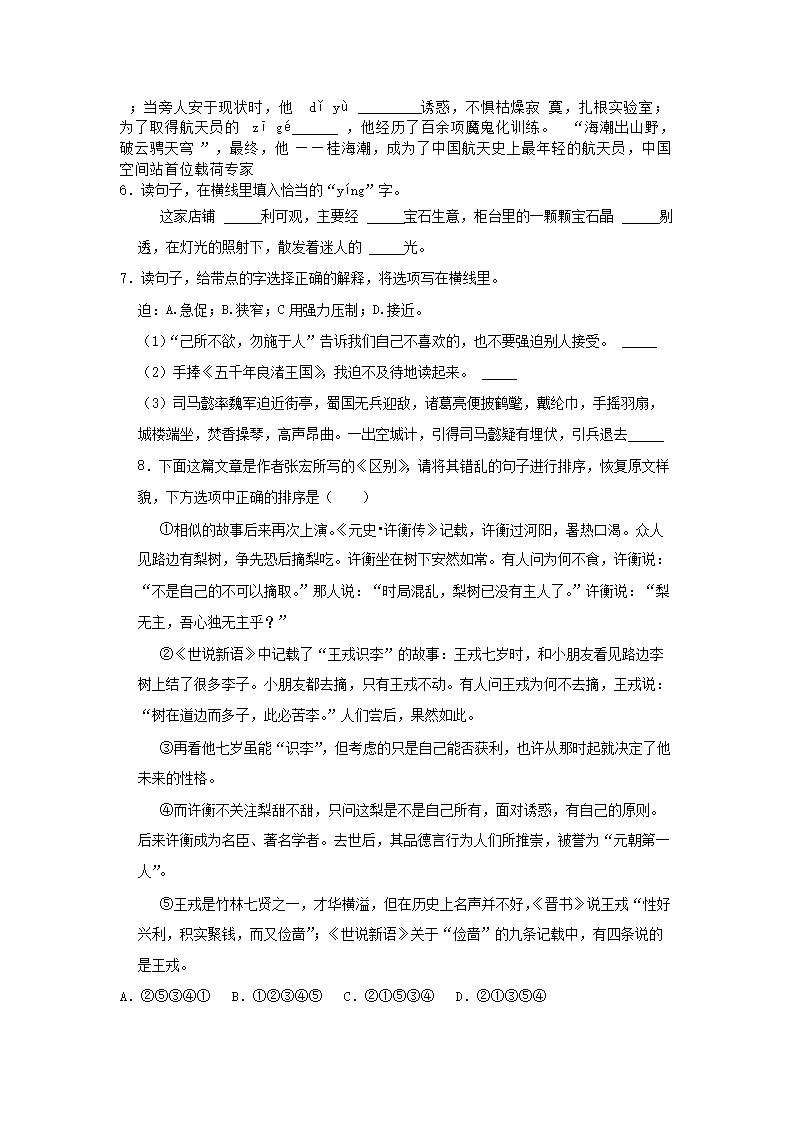- 2022-2023年廣東省市從化區(qū)六年級下冊期末語文試卷及答案