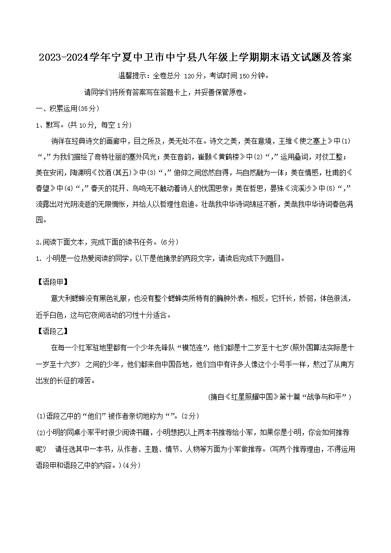 2023-2024學(xué)年寧夏中衛(wèi)市中寧縣八年級(jí)上學(xué)期期末語(yǔ)文試題及答案(Word版)