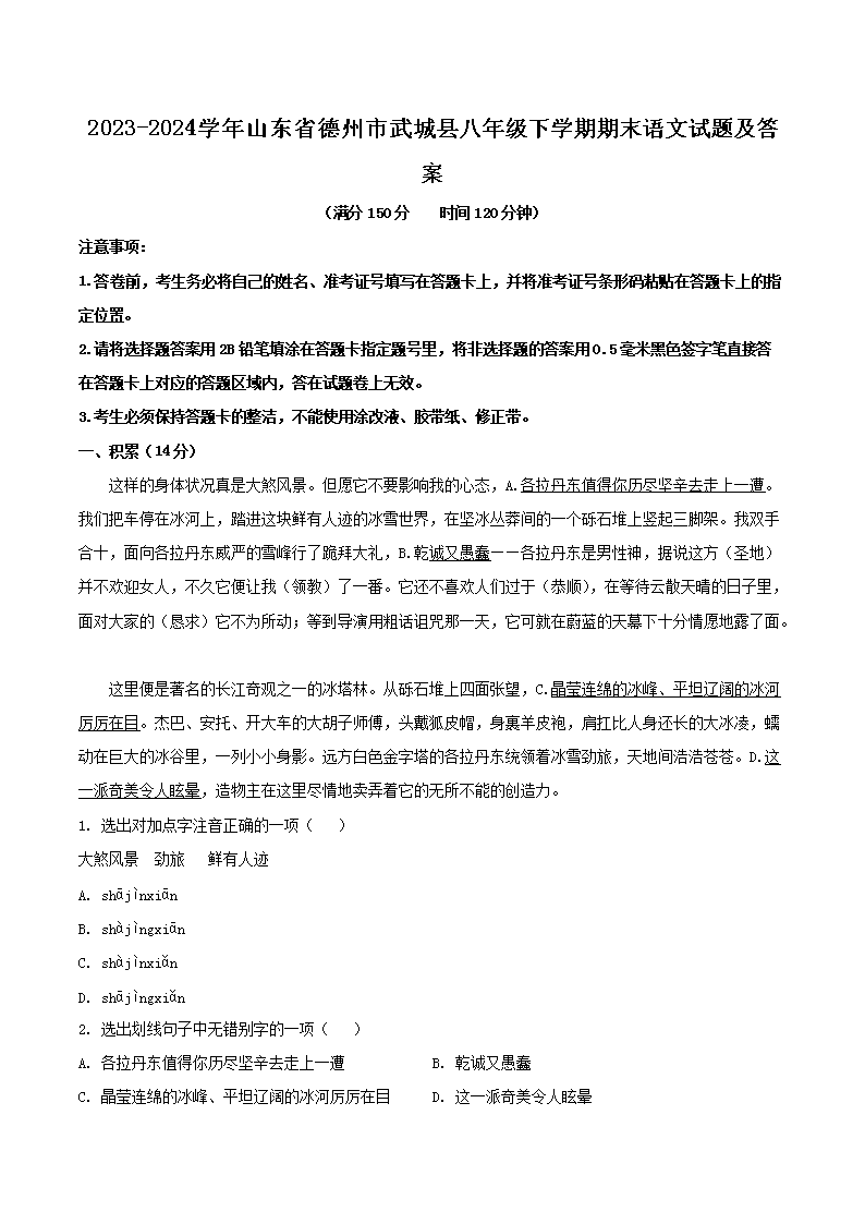 時(shí)間:2025-05-08 17:25:00 來源:無憂考網(wǎng) [字體:小 中 大]【文檔名稱】 2023-2024學(xué)年山東省德州市武城縣八年級(jí)下學(xué)期期末語文試題及答案(Word版).doc