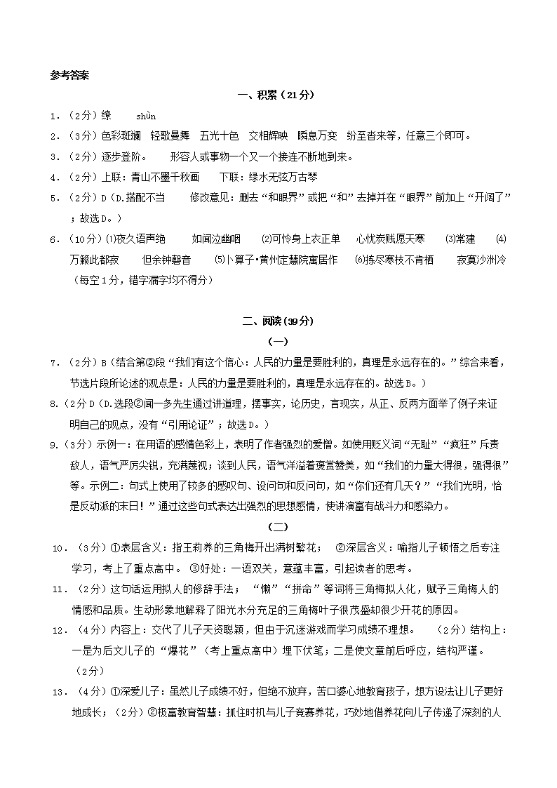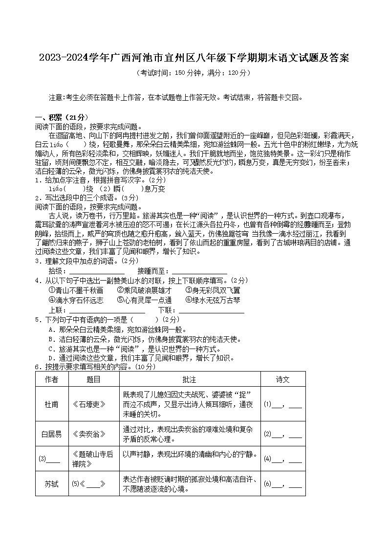 【文檔預覽】 無憂考網整理發(fā)布2023-2024學年廣西河池市宜州區(qū)八年級下學期期末語文試題及答案(Word版),前五頁預覽如下: