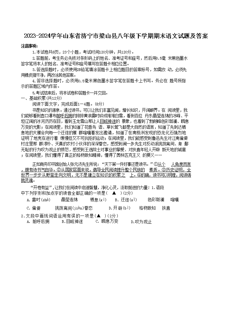2023-2024學(xué)年山東省濟寧市梁山縣八年級下學(xué)期期末語文試題及答案(Word版)