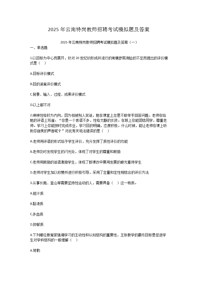 【文檔名稱(chēng)】 2025年云南特崗教師招聘考試模擬題及答案(Word版).doc