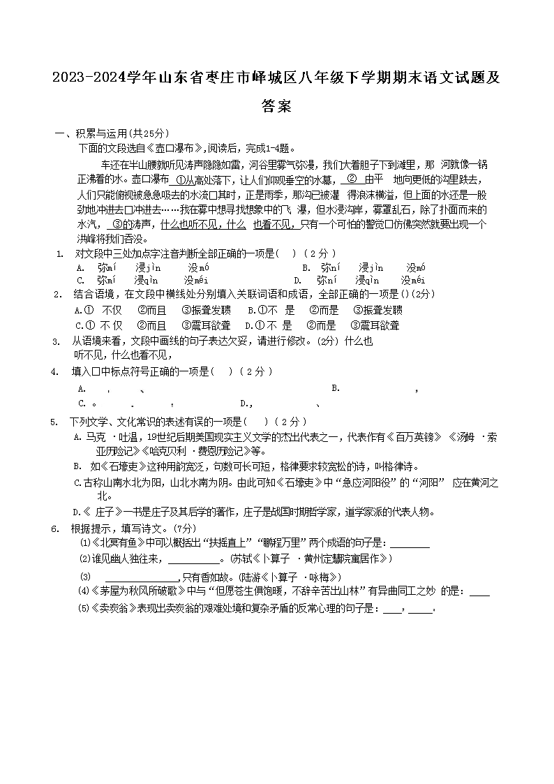 2023-2024學(xué)年山東省棗莊市嶧城區(qū)八年級下學(xué)期期末語文試題及答案(Word版)