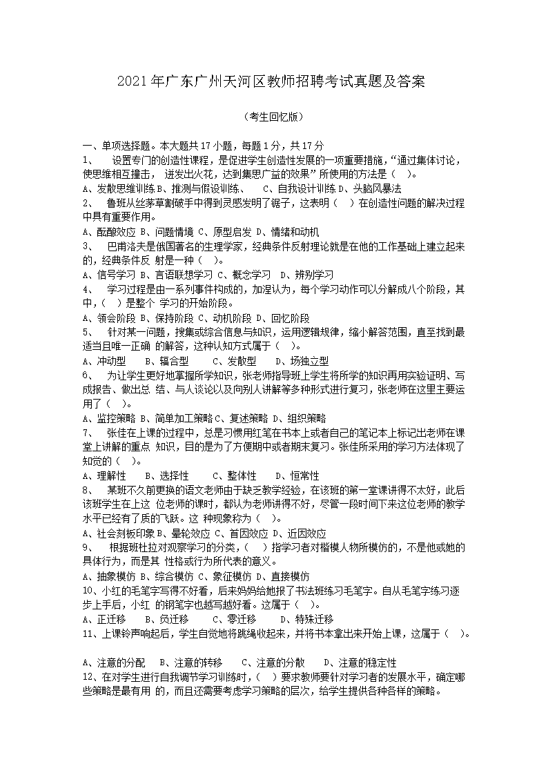 【文檔名稱】 2021年廣東廣州天河區(qū)教師招聘考試真題及答案(Word版).doc