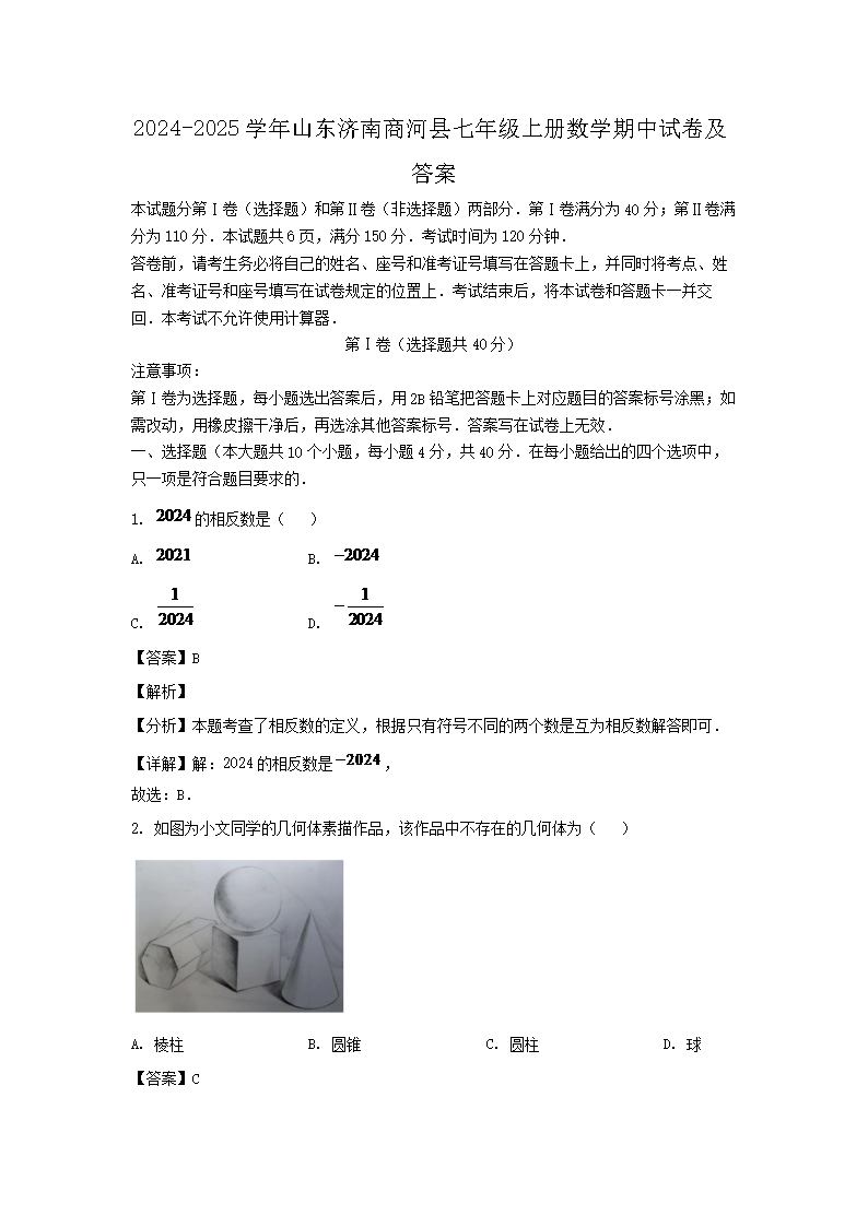 2024-2025學(xué)年山東濟(jì)南商河縣七年級上冊數(shù)學(xué)期中試卷及答案(Word版)
