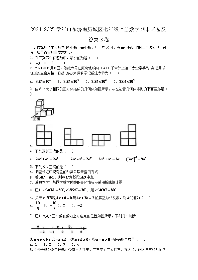 - 2024-2025學年山東濟南七年級上冊數(shù)學期末試卷及答案
