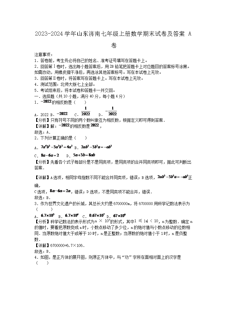 【文檔預(yù)覽】 無(wú)憂考網(wǎng)整理發(fā)布2023-2024學(xué)年山東濟(jì)南七年級(jí)上冊(cè)數(shù)學(xué)期末試卷及答案A卷(Word版),前五頁(yè)預(yù)覽如下: