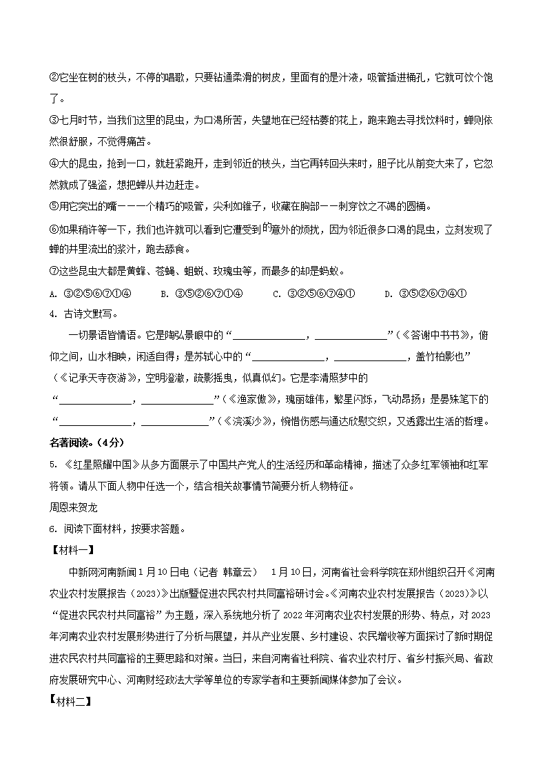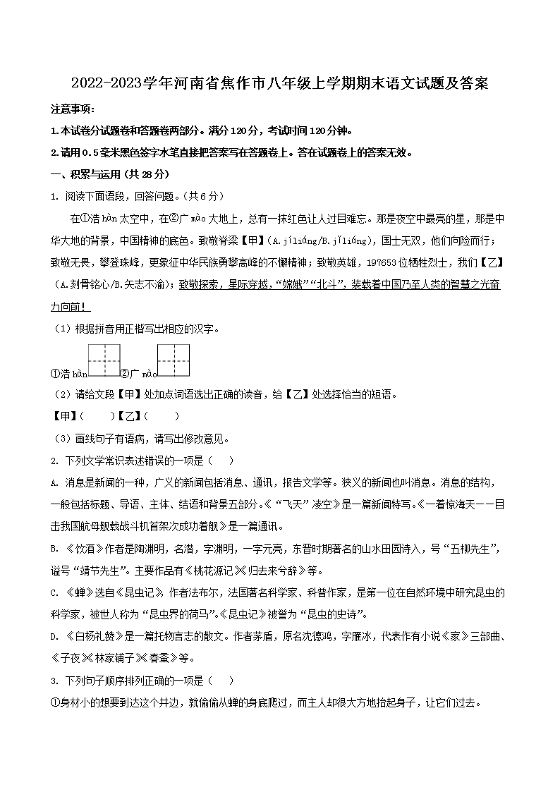 2022-2023學(xué)年河南省焦作市八年級(jí)上學(xué)期期末語文試題及答案(Word版)