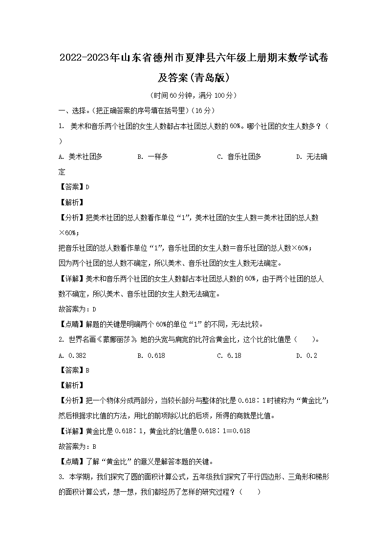 【文檔名稱】 2022-2023年山東省德州市夏津縣六年級上冊期末數(shù)學試卷及答案(青島版)(Word版).doc