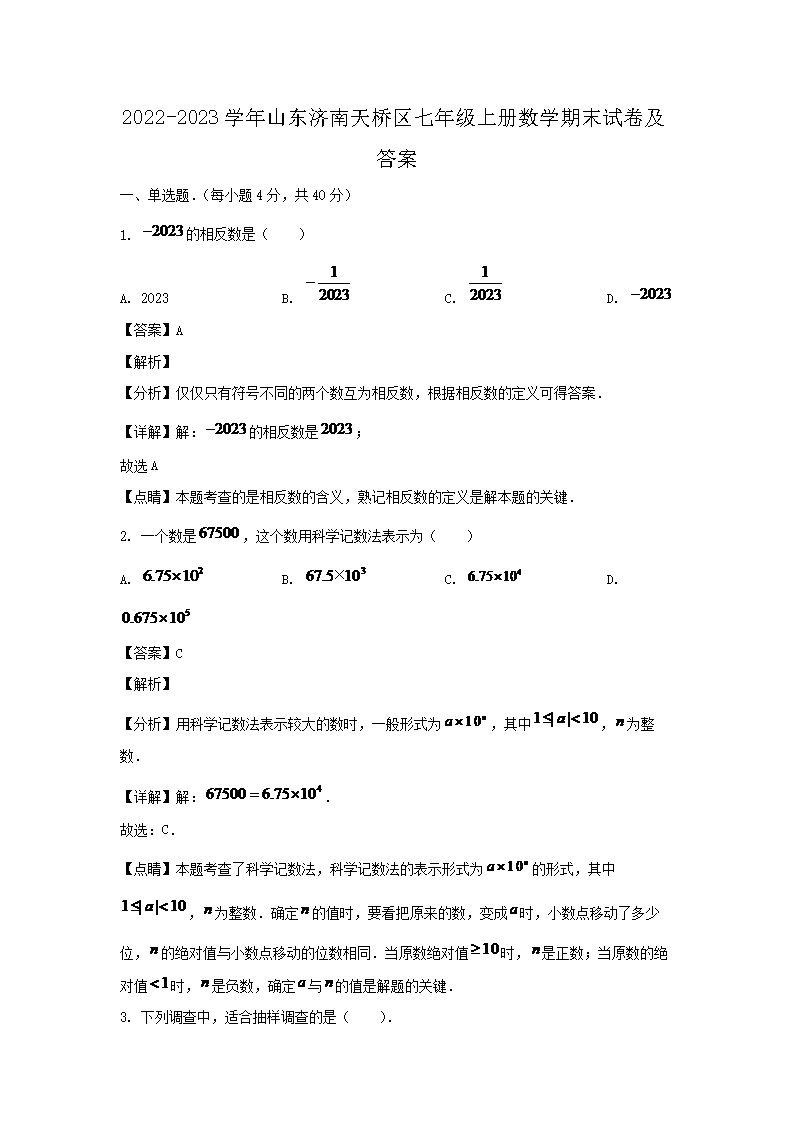 2022-2023學(xué)年山東濟(jì)南天橋區(qū)七年級上冊數(shù)學(xué)期末試卷及答案(Word版)
