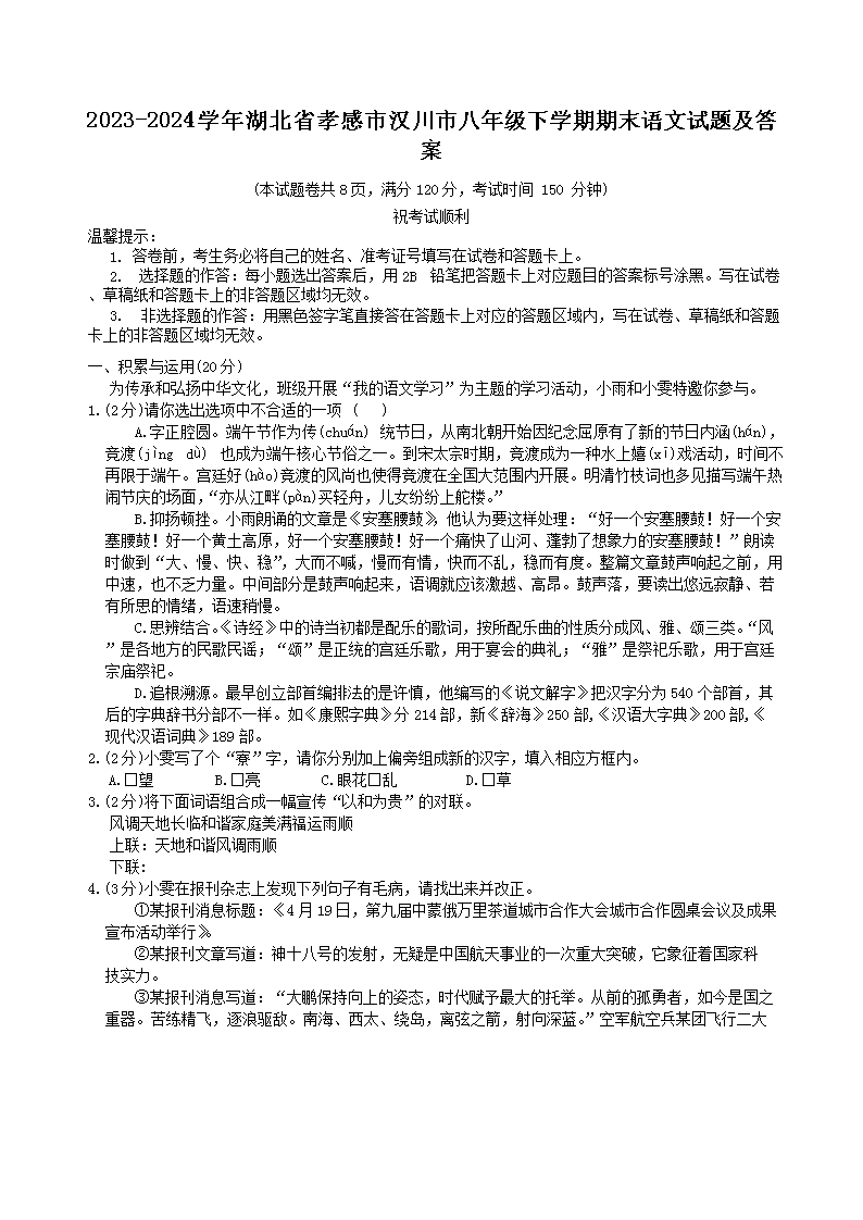 【文檔名稱】 2023-2024學年湖北省孝感市漢川市八年級下學期期末語文試題及答案(Word版).doc