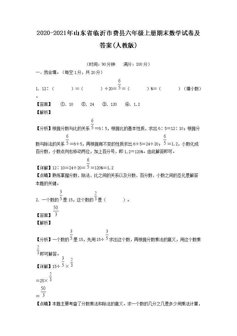 2020-2021年山東省臨沂市費(fèi)縣六年級(jí)上冊(cè)期末數(shù)學(xué)試卷及答案(人教版)(Word版)