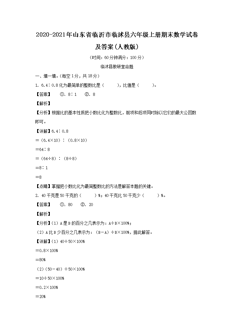 【文檔名稱】 2020-2021年山東省臨沂市臨沭縣六年級上冊期末數(shù)學試卷及答案(人教版)(Word版).doc