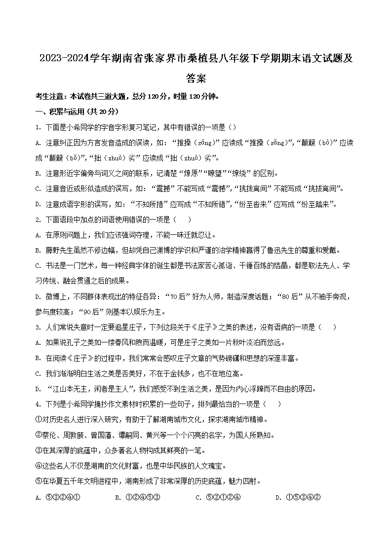 2023-2024學(xué)年湖南省張家界市桑植縣八年級下學(xué)期期末語文試題及答案(Word版)