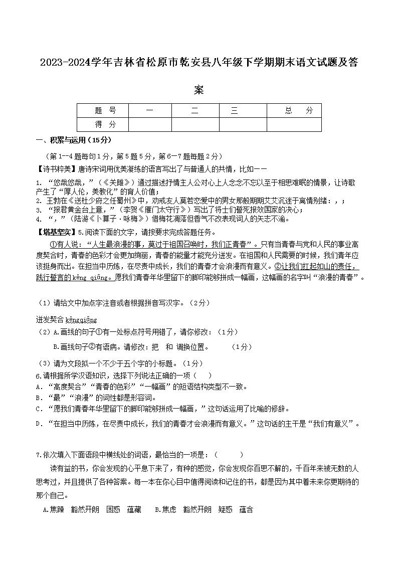 2023-2024學(xué)年吉林省松原市乾安縣八年級下學(xué)期期末語文試題及答案(Word版)