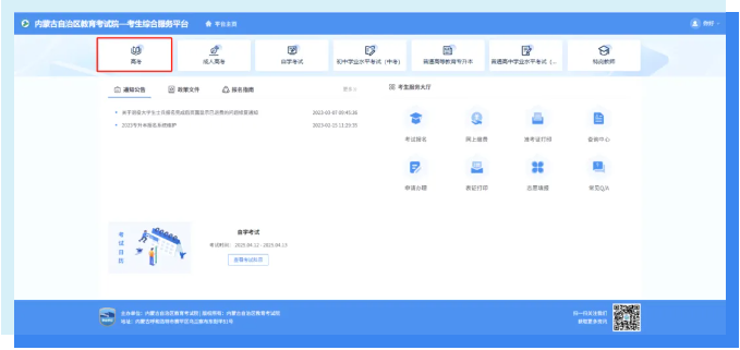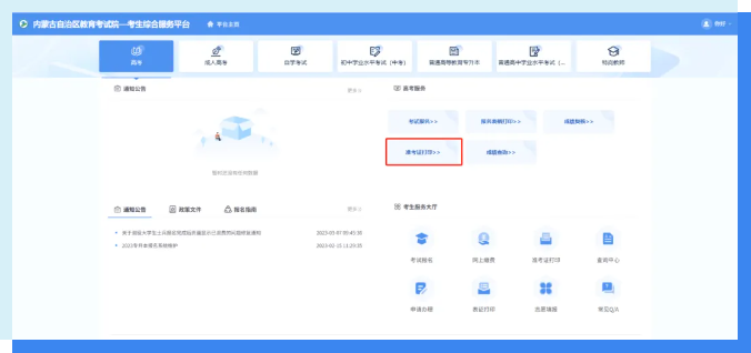 2025年普通高考準考證打印功能今日開通,考生可通過點擊內(nèi)蒙古招生考試信息網(wǎng)主頁右側(cè)飄窗“2025年內(nèi)蒙古自治區(qū)普通高校招生統(tǒng)一考試準考證打印” 鏈接,登錄考生綜合服務平臺(https://www4.nm.zsks.cn/BaseStudent/),選擇頁面上方“高考”,點擊“準考證打印”,下載并打印2025年普通高考準考證。