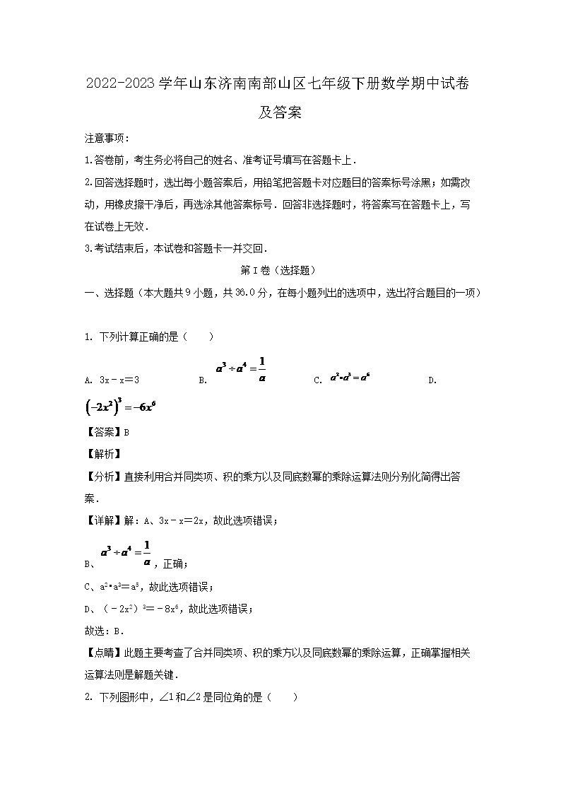 2022-2023學(xué)年山東濟南南部山區(qū)七年級下冊數(shù)學(xué)期中試卷及答案(Word版)