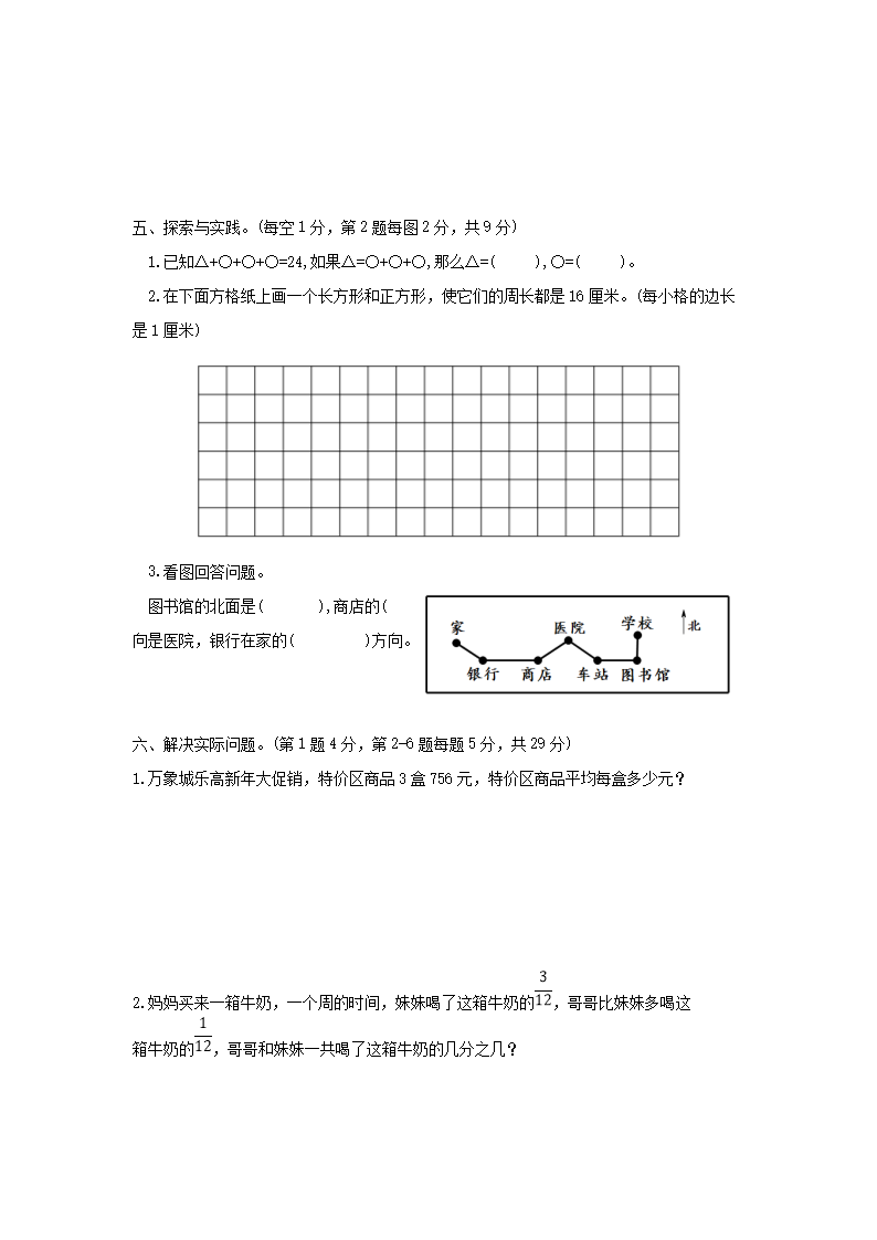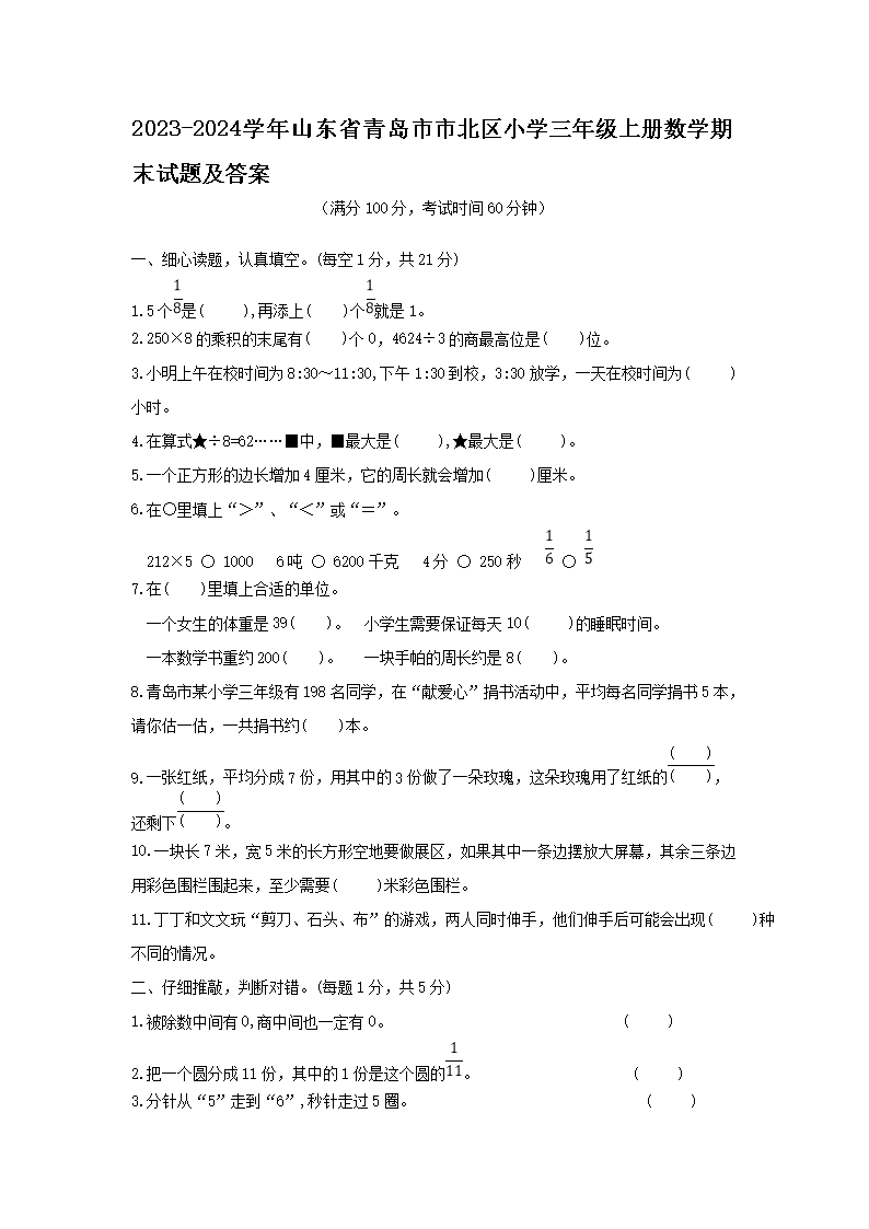 2023-2024學(xué)年山東省青島市市北區(qū)小學(xué)三年級(jí)上冊(cè)數(shù)學(xué)期末試題及答案(Word版)