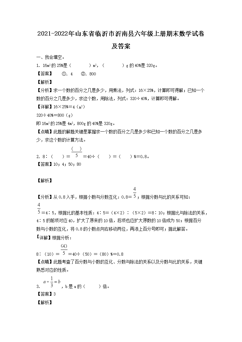【文檔名稱】 2021-2022年山東省臨沂市沂南縣六年級上冊期末數(shù)學試卷及答案(Word版).doc