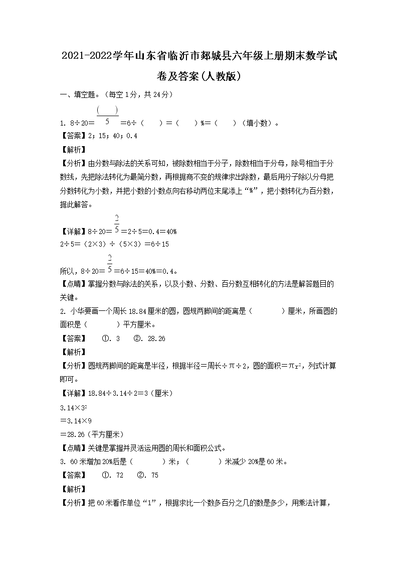 2021-2022學(xué)年山東省臨沂市郯城縣六年級(jí)上冊(cè)期末數(shù)學(xué)試卷及答案(人教版)(Word版)