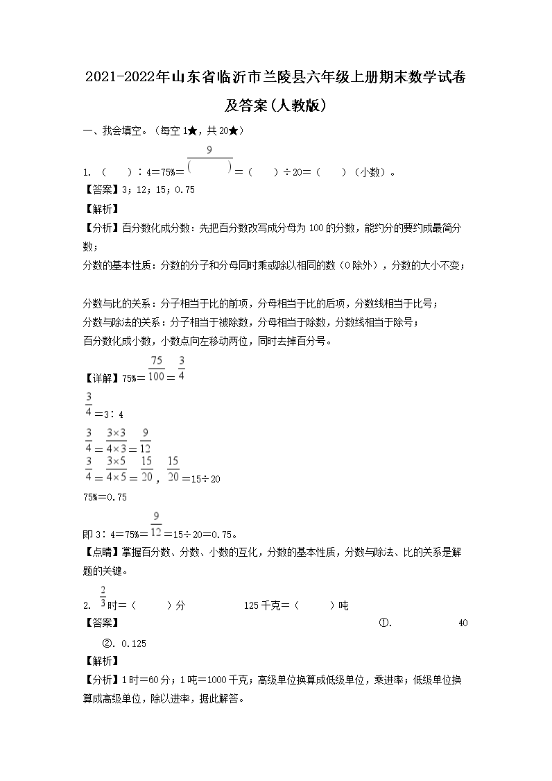 2021-2022年山東省臨沂市蘭陵縣六年級上冊期末數(shù)學(xué)試卷及答案(人教版)(Word版)