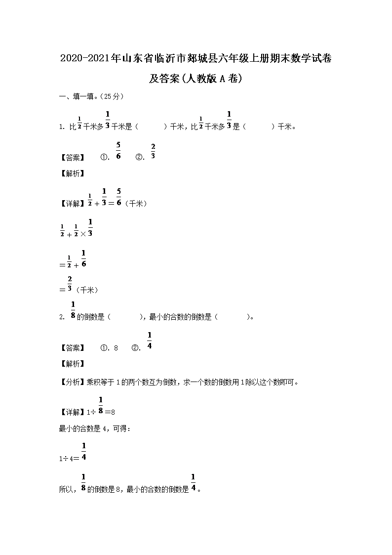 - 2020-2021年山東省臨沂市郯城縣六年級(jí)上冊(cè)期末數(shù)學(xué)試卷及答案(人教版)