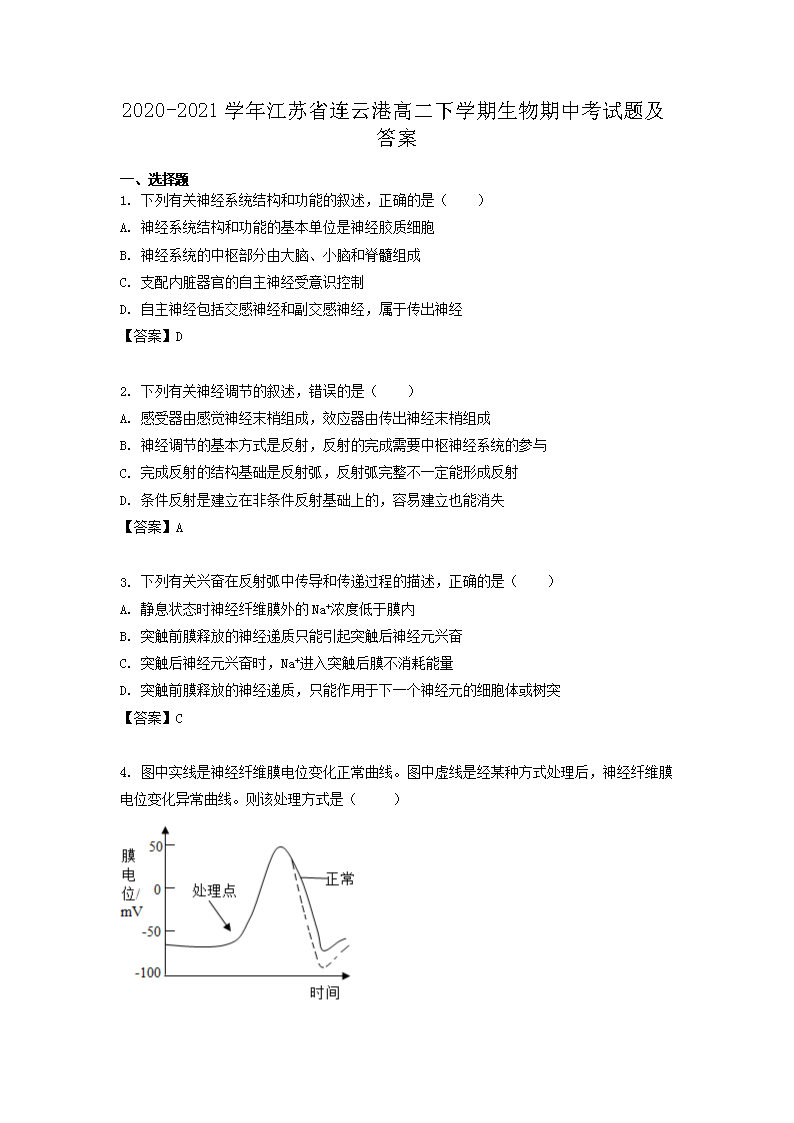 時(shí)間:2025-05-30 17:27:00 來源:無憂考網(wǎng) [字體:小 中 大]【文檔名稱】 2020-2021學(xué)年江蘇省連云港高二下學(xué)期生物期中考試題及答案(Word版).doc