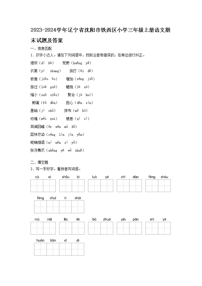 2023-2024學(xué)年遼寧省沈陽市鐵西區(qū)小學(xué)三年級上冊語文期末試題及答案(Word版)