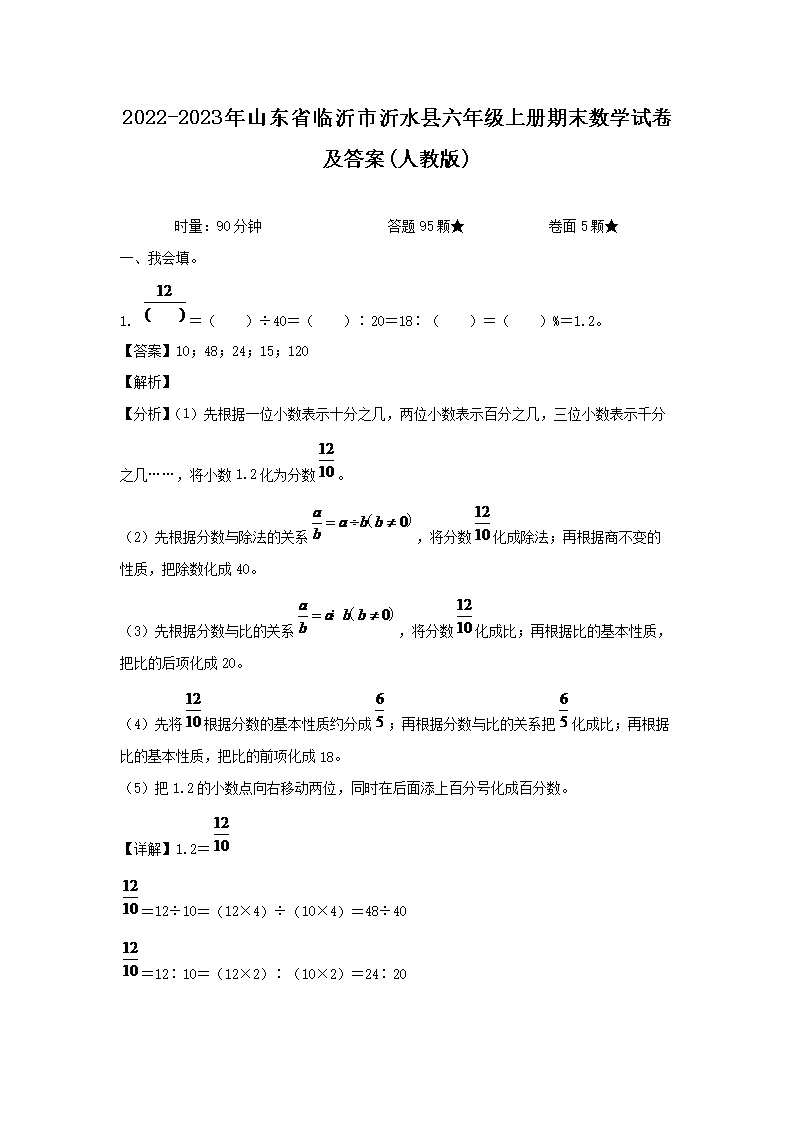 【文檔名稱】 2022-2023年山東省臨沂市沂水縣六年級上冊期末數(shù)學試卷及答案(人教版)(Word版).doc