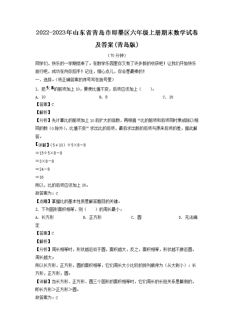 2022-2023年山東省青島市即墨區(qū)六年級上冊期末數(shù)學(xué)試卷及答案(青島版)(Word版)