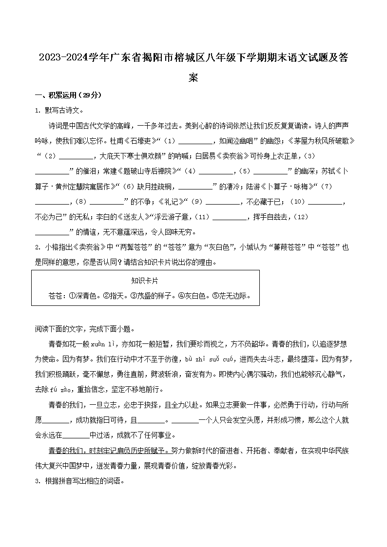 2023-2024學(xué)年廣東省揭陽市榕城區(qū)八年級下學(xué)期期末語文試題及答案(Word版)