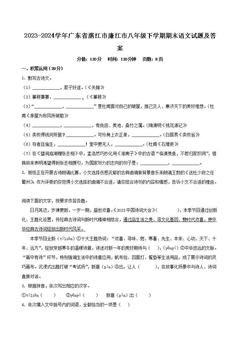 【文檔名稱】 2023-2024學年廣東省湛江市廉江市八年級下學期期末語文試題及答案(Word版).doc