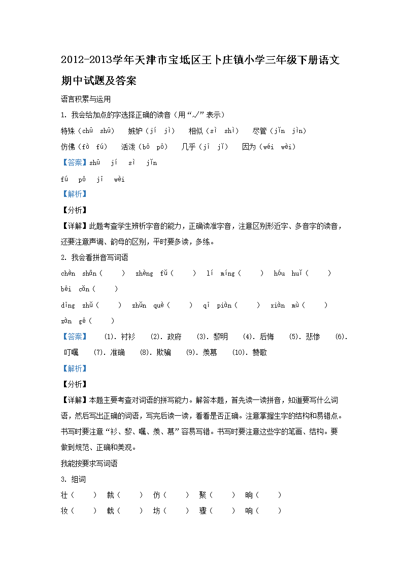 2012-2013學(xué)年天津市寶坻區(qū)王卜莊鎮(zhèn)小學(xué)三年級下冊語文期中試題及答案(Word版)