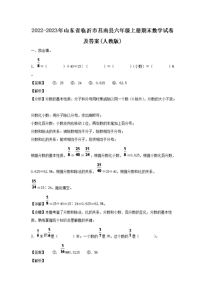 2022-2023年山東省臨沂市莒南縣六年級(jí)上冊(cè)期末數(shù)學(xué)試卷及答案(人教版)(Word版)